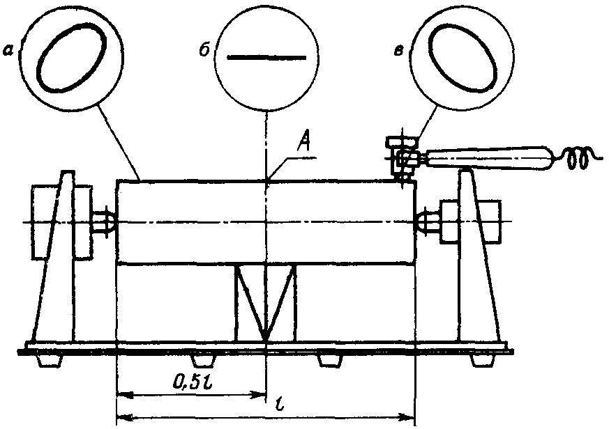 3.2.6. Переставляют приемный преобразователь вдоль верхней поверхности изделия по его длине, одновременно наблюдая на экране осциллографа за изменением амплитуды и фазы колебаний. На резонансной частоте основного тона изгибных колебаний амплитуда колебаний максимальна в центре и на концах изделия, а в узловых линиях имеет минимальное значение. При переносе датчика-приемника через узловые линии фаза колебаний должна меняться на 180° (черт. 4).