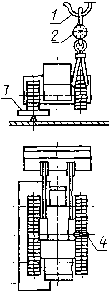 Стальные канаты одним концом следует крепить к точкам строповки на машине, другим - к подвешенному динамометру, если используется динамометр растяжения. Затем машина должна быть поднята или опоры ее должны быть опущены (см.
