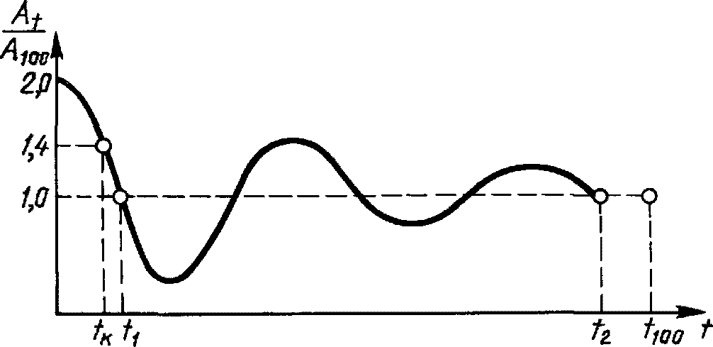 Значение tк, когда At/A100 = 1,4 на начальном участке с положительным наложением, должно быть определено по диаграмме. Должны быть определены t1 и t2, когда At/A100 <= 1,0 во всех зонах отрицательного наложения. Учитывая погрешность измерения, зонами отрицательного наложения до 10% можно пренебречь. Длины кабелей Lк, L1 и L2, соответствующие tк, t1 и t2, должны быть вычислены по формуле