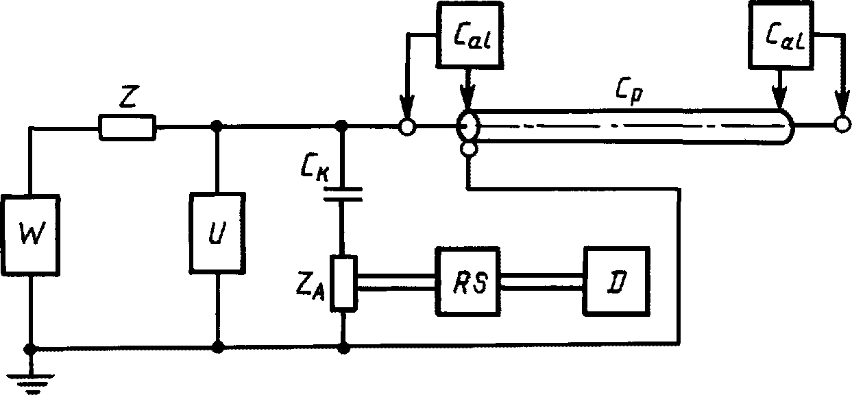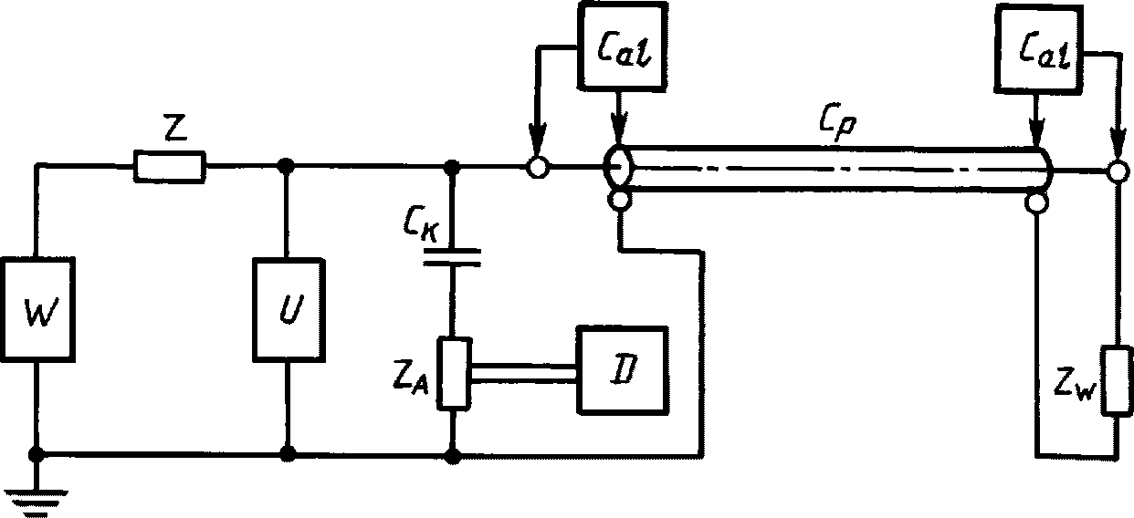 Измерительная схема включает в себя соединительный конденсатор, испытуемый кабель, измерительный элемент, соединительные провода и измерительный прибор (детектор).