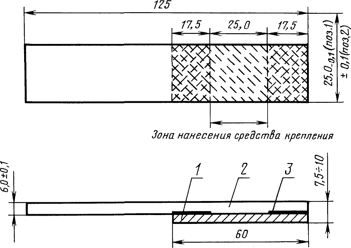 2.5. Перед склеиванием поверхности металла и резины обрабатывают в соответствии с требованиями, указанными в НТД или технической документации на клей, резину или изделие. На металлической пластине отмечают при помощи линейки карандашом зону нанесения средства крепления, как указано на
