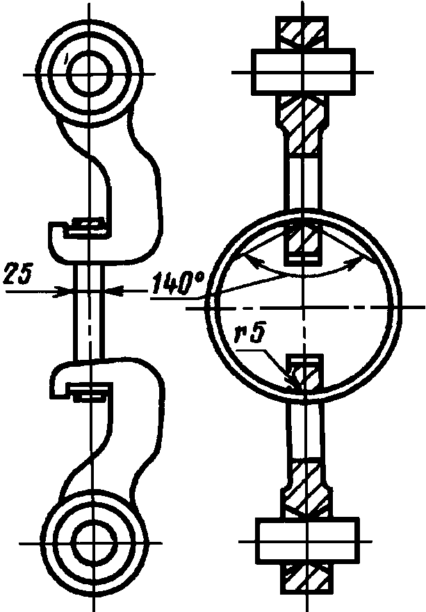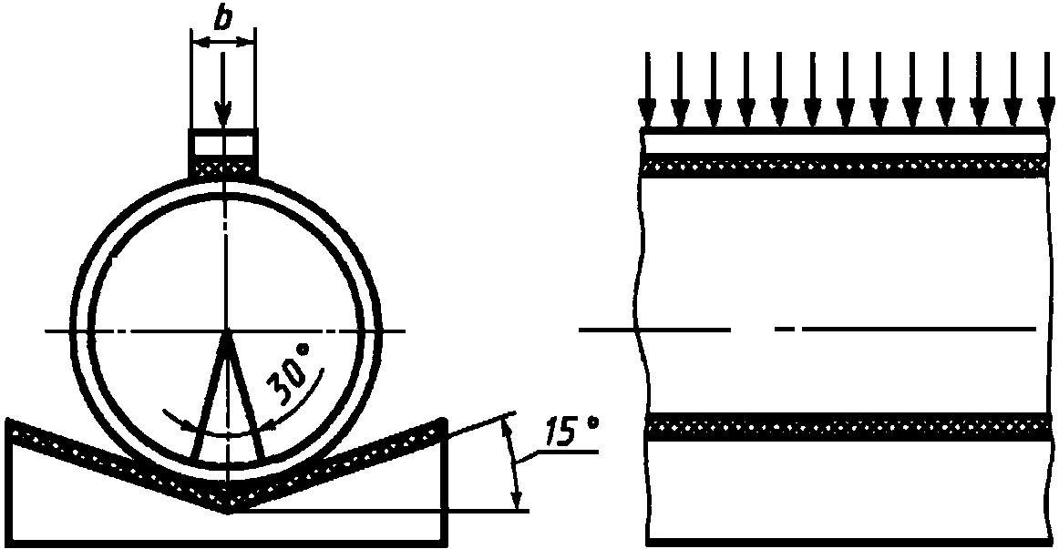 4.3. Испытание прочности на изгиб должно проводиться на кольцах шириной 25 мм, отрезаемых от гладкого конца трубы. Кольцо поддерживается двумя диаметрально расположенными опорами и нагружается посредством этих опор изнутри (черт. 5).