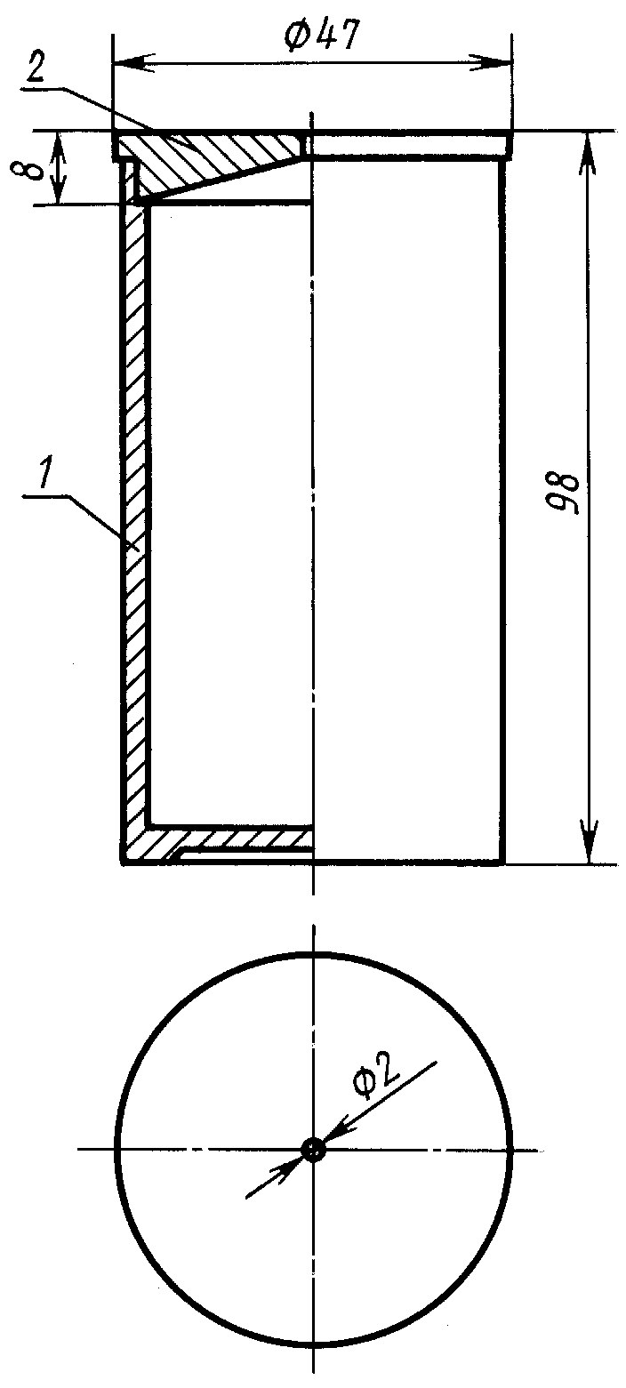 Прибор (см. чертеж) представляет собой дюралюминиевый стакан с крышкой. Крышка, плотно входящая в стакан до упора в торец, имеет коническую вытачку, которая предназначена для удаления избыточного количества испытуемого материала через центральное отверстие диаметром 2 мм. На внешней стороне дна стакана ставят клеймо, указывающее собственную массу стакана.