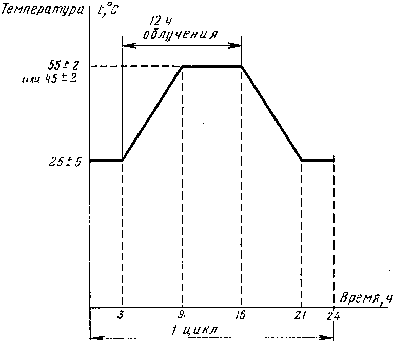Если основной целью испытания является проверка воздействия ультрафиолетовой части спектра, испытание проводят следующим образом. Изделия помещают в камеру, включают источники инфракрасного и ультрафиолетового излучения, после чего температуру воздуха в камере (в тени) устанавливают (55 +/- 2) °C - для изделий, у которых в нормативно-технической документации установлено рабочее и предельное рабочее значение температуры, (45 +/- 2) °C - для изделий, у которых в нормативно-технической документации установлено только рабочее значение температуры. Облучение образцов производят в течение 120 ч непрерывно или с перерывами.