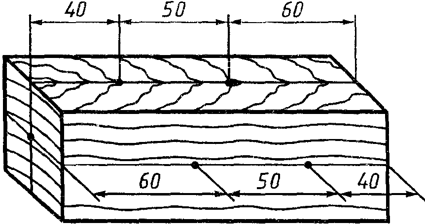 3.2. В образец перпендикулярно его поверхности в радиальном, тангенциальном и продольном направлениях забивают гвозди или ввинчивают шурупы в количестве 6 шт. по схеме разметки образца, изображенной на черт. 2. Глубина забивания гвоздей (без заострения) - (30 +/- 1) мм, ввинчивания шурупов - (20 +/- 1) мм.