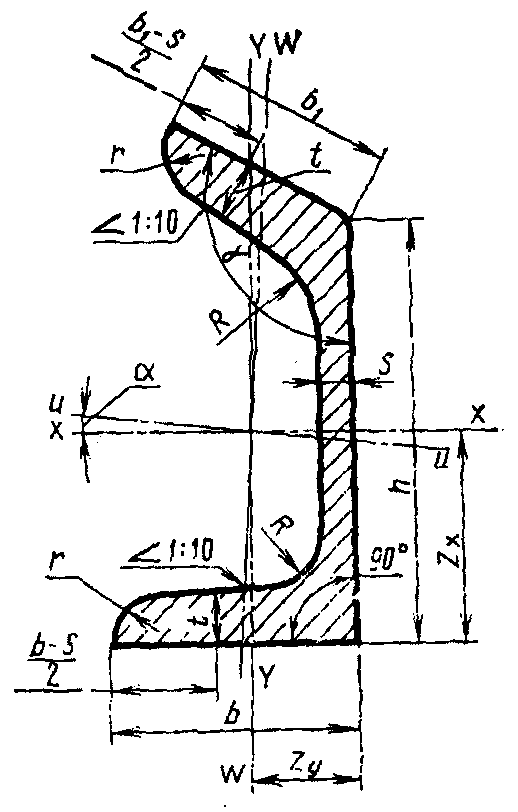 h - высота швеллера; b - ширина полки;