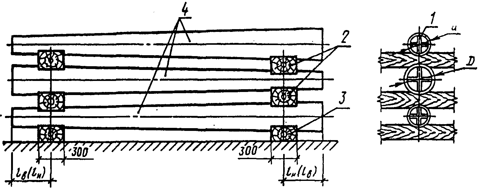 5.5. Нижний ряд стоек укладывать следует на подкладки, по выровненному основанию, а последующие ряды - на прокладки (в виде шпал с вырезами или набитыми ограничителями), располагаемые по вертикали одна над другой на расстояниях от нижнего и верхнего концов стойки согласно черт. 3.