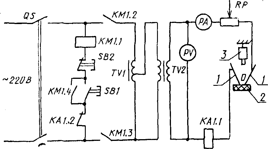 QS - выключатель; KM - пускатель; TV1 - автотрансформатор;