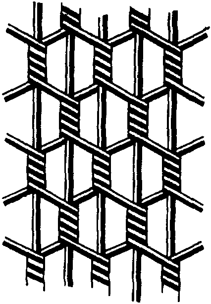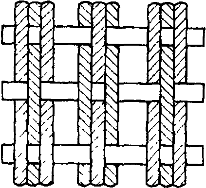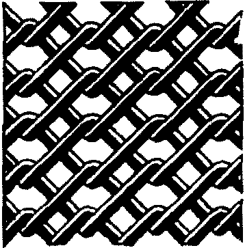 Сетка тканая саржевого переплетения прядковая фильтровая (мультиплекс) | ![]() | Пряди основы переплетаются с прядями утка вплотную. Пряди из пяти или восьми проволок. Ячейки в свету отсутствуют | Сетка характеризуется числом прядей основы и утка на 1 дм, числом проволок в пряди основы и утка и диаметром утка | Ячейки в свету отсутствуют. Число прядей основы на 1 дм 140, число проволок в пряди основы 5; число прядей утка на 1 дм 140; число проволок в пряди утка 8 | Диаметр проволоки пряди основы 0,18; проволоки пряди утка 0,12 | Проволока из монель-металла | Для фильтрации |