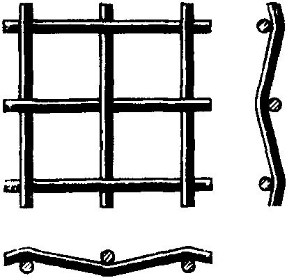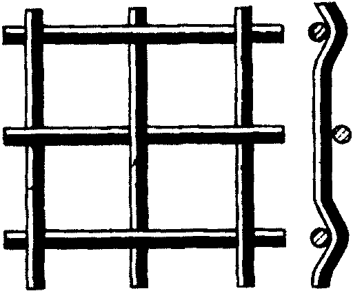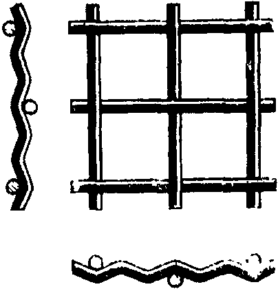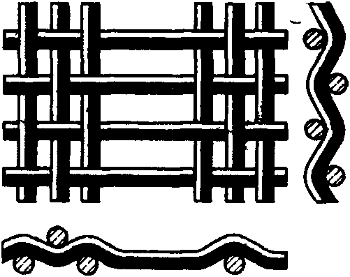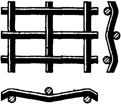 Сетка частично рифленая с квадратными ячейками | ![]() | Проволоки основы (без предварительного рифления) переплетаются с предварительно рифлеными проволоками утка | Сетка характеризуется размером стороны ячейки в свету и диаметром проволоки. За размер стороны ячейки в свету принимается расстояние между соседними проволоками основы или соседними проволоками утка | От 1,6 до 25,0 | От 0,9 до 4,5 | Стальная термически необработанная низкоуглеродистая, термически обработанная углеродистая и высоколегированная (травленая) проволока | Для разделения сыпучих тел по крупности |