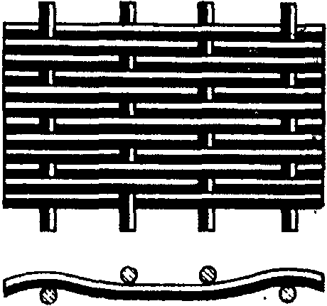 Сетка плетеная стержневая секционная | ![]() | Спирали соединены между собой стержнями Направление спиралей попеременно: правое и левое | Сетка характеризуется шагом спирали, диаметром проволоки спирали и стержней | Шаг спирали от 12 до 20 | Диаметр проволоки спиралей от 2,2 до 3,0; стержней от 2,5 до 3,0 | Стальная термически необработанная высоколегированная проволока | Для конвейерных сушилок |