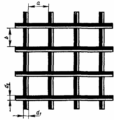 Сетка из штампованной проволоки щелевая | ![]() | Каждые проволоки из пряди поперечных проволок переплетаются с одиночными продольными проволоками. В местах перекрещивания продольные проволоки отштампованы, а поперечные имеют изгиб рифления | Сетка характеризуется размером стороны ячейки в свету и диаметром проволоки. За размер стороны ячейки в свету принимается расстояние между соседними прядями поперечных проволок и между соседними продольными проволоками | Ширина щели от 1,25 до 10,0; длина щели от 25,0 до 100,0 | От 1,0 до 3,5 | Стальная углеродистая проволока | Для разделения сыпучих тел по крупности |