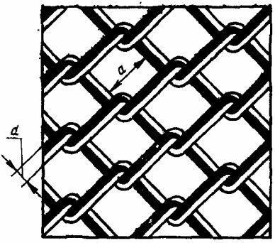 Сетка из штампованной проволоки с квадратными ячейками | ![]() | Поперечные и продольные проволоки в местах переплетения отштампованы на глубину, равную диаметру проволоки | Сетка характеризуется размером стороны ячейки в свету и диаметром проволоки. За размер стороны ячейки в свету принимается расстояние между соседними поперечными проволоками или соседними продольными проволоками | От 10,0 до 70,0 | От 3,0 до 12,0 | Стальная углеродистая проволока | Для разделения сыпучих тел по крупности |