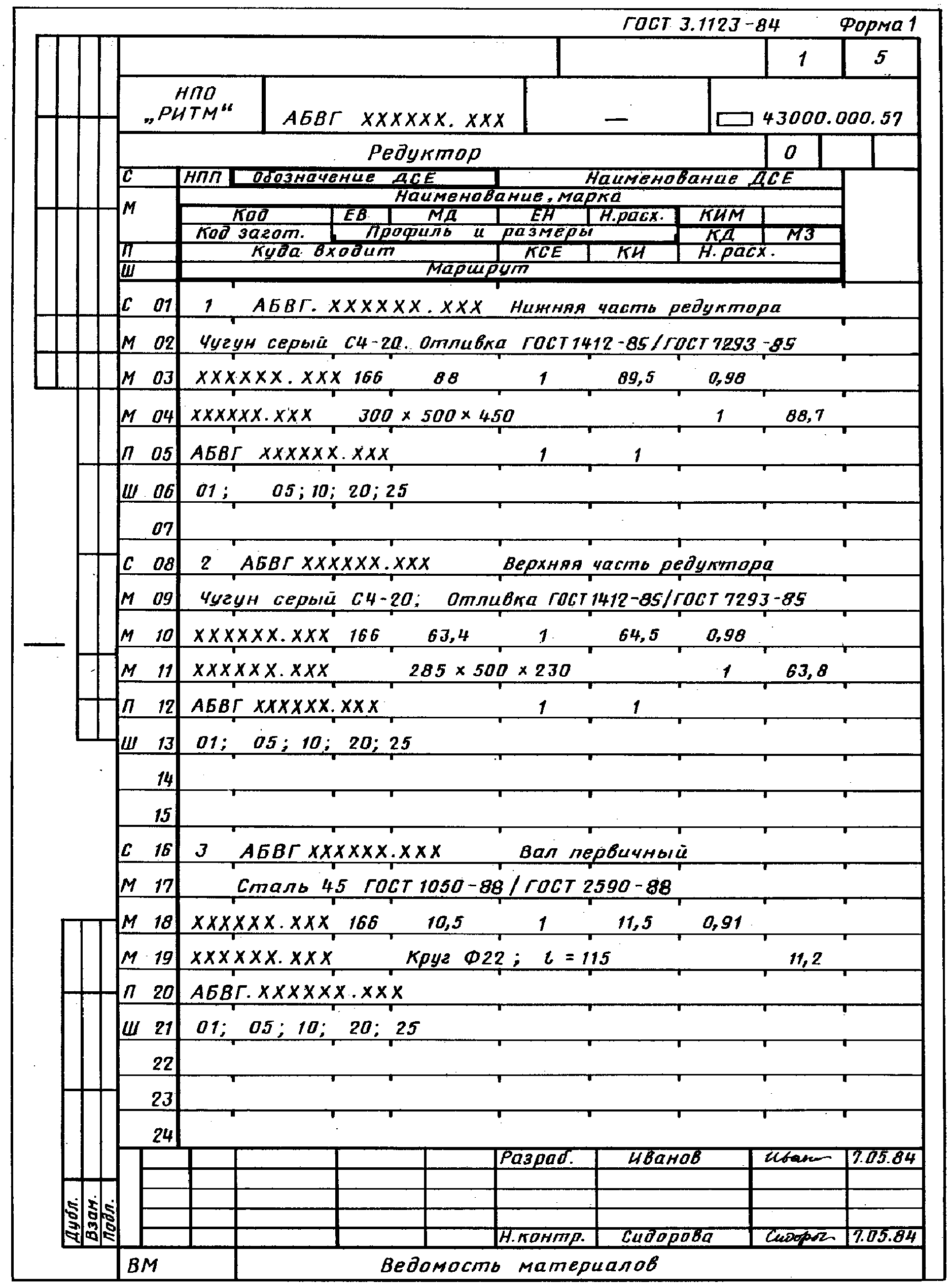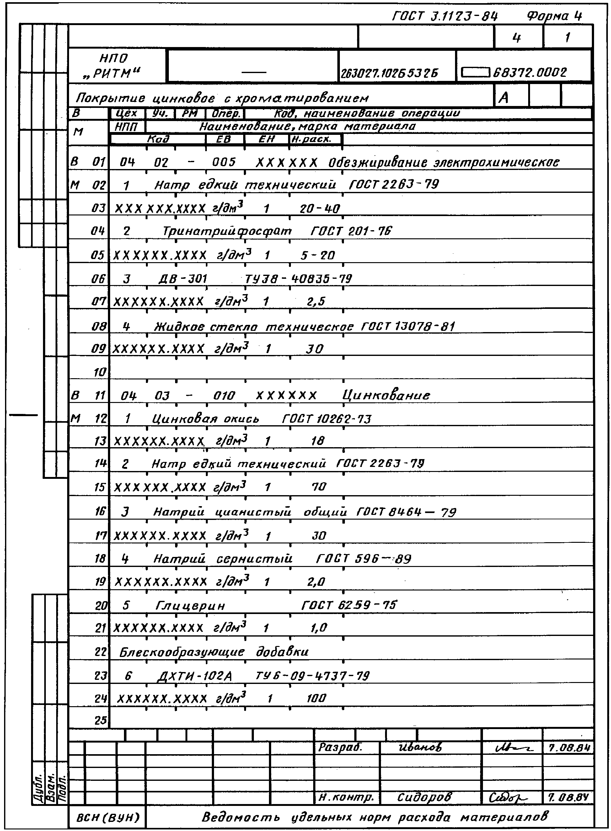 "ГОСТ 3.1123-84. Межгосударственный стандарт. Единая система технологической документации. Формы и правила оформления технологических документов, применяемых при нормировании расхода материалов"