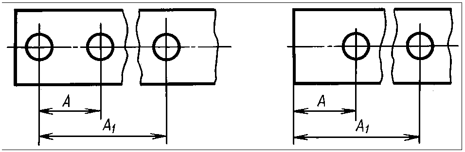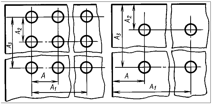 б - отверстия (с числом до четырех) расположены в два ряда и координированы относительно их осей | Обработка отверстий по разметке, пробивка штампами обычной точности, литье нормальной точности | I | 2-й ряд |