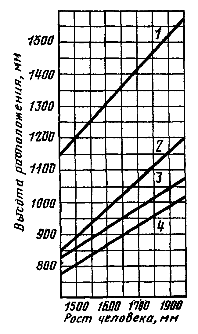 подставки для ног при нерегулируемой высоте рабочей поверхности. В этом случае высоту рабочей поверхности устанавливают по номограмме, приведенной на