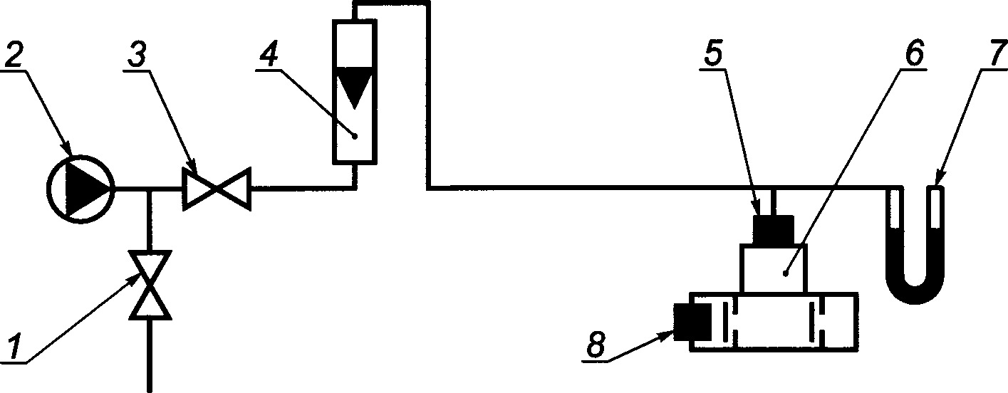 - установка (рисунок 4), состоящая из расходомера с верхним пределом измерения объемного расхода воздуха 4,0 м3/ч и погрешностью не более 2,5%, регулирующего вентиля, соединительных трубок с внутренним диаметром от 6,3 до 16 мм;