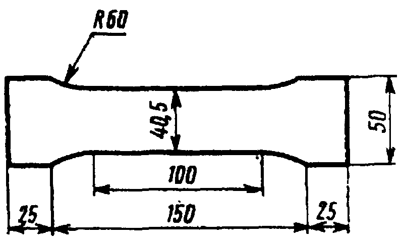 4.4. Для определения прочности и относительного удлинения при разрыве из образцов размерами 190 х 230 мм, прошедших определенное количество циклов испытаний, вырубаются при помощи штанцевого ножа три образца в форме двусторонней лопатки (черт. 4). Образцы испытывают на разрыв со скоростью 30 мм/мин.