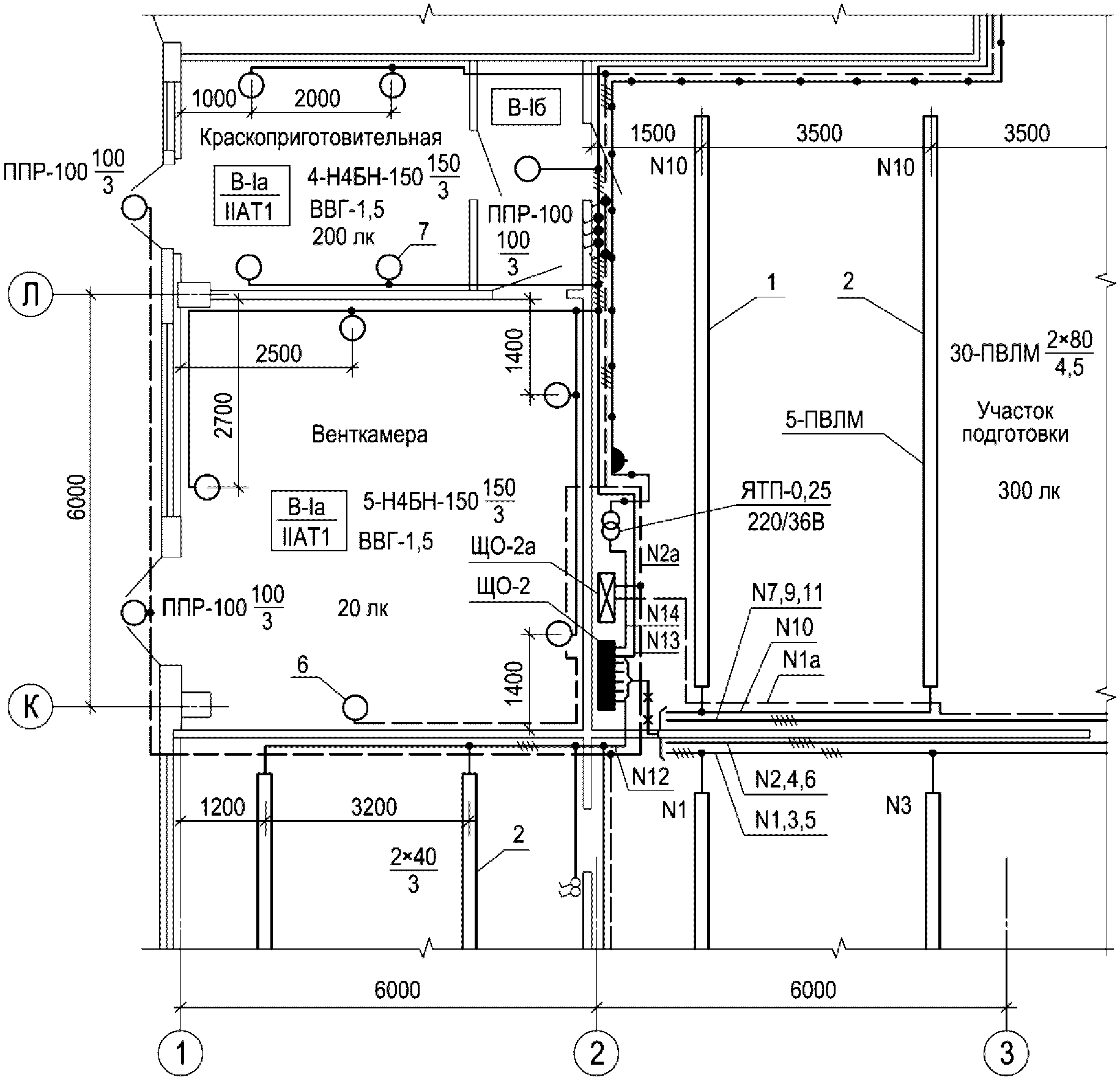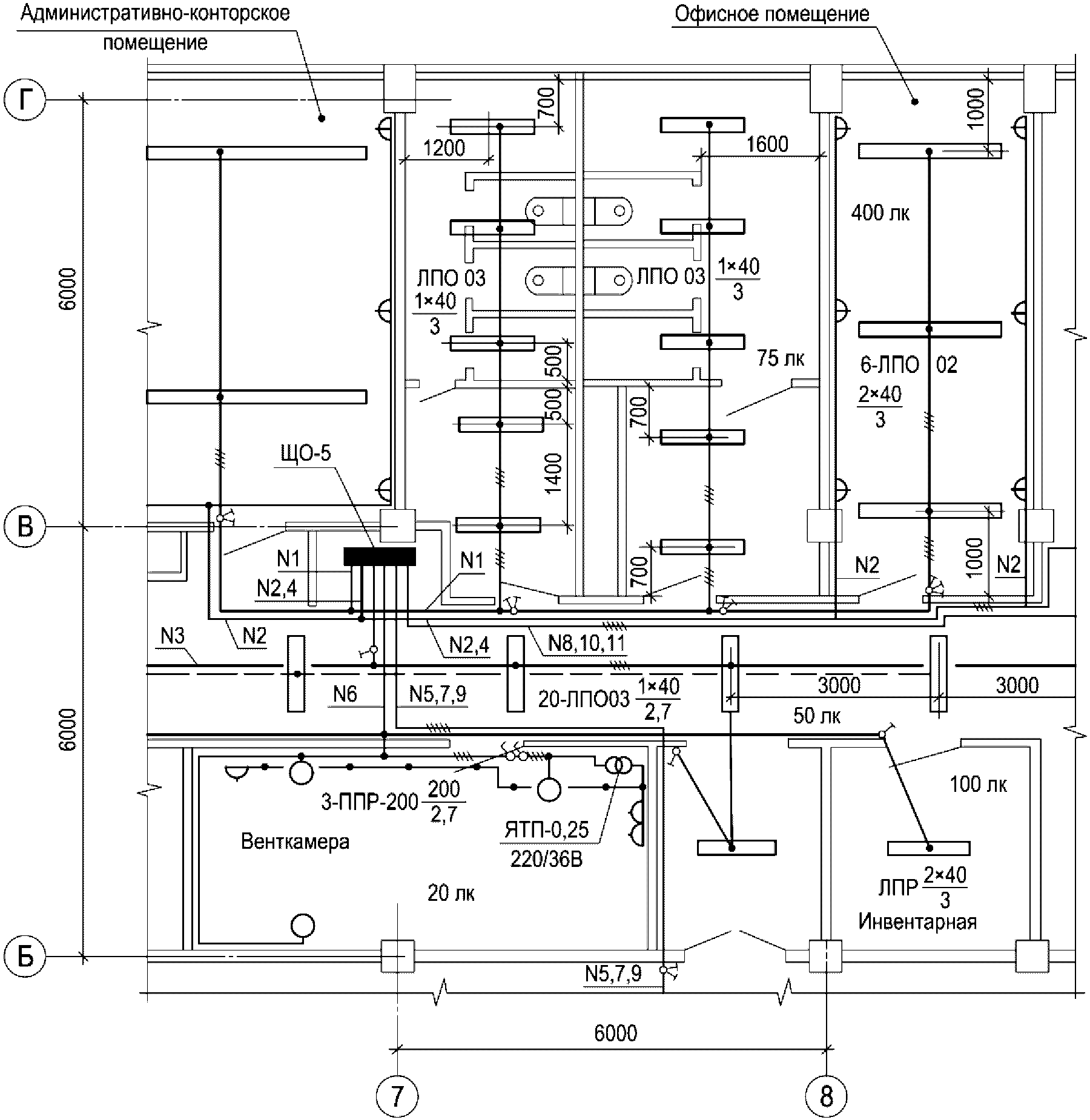 6. Обозначение способов прокладки, марок проводников и сечений групповой сети в помещении указывают (через дефис) в следующем порядке: марка проводников - сечение, мм 2 - способ прокладки | ВВГнг-LS-1(3x2,5)-т20 |
