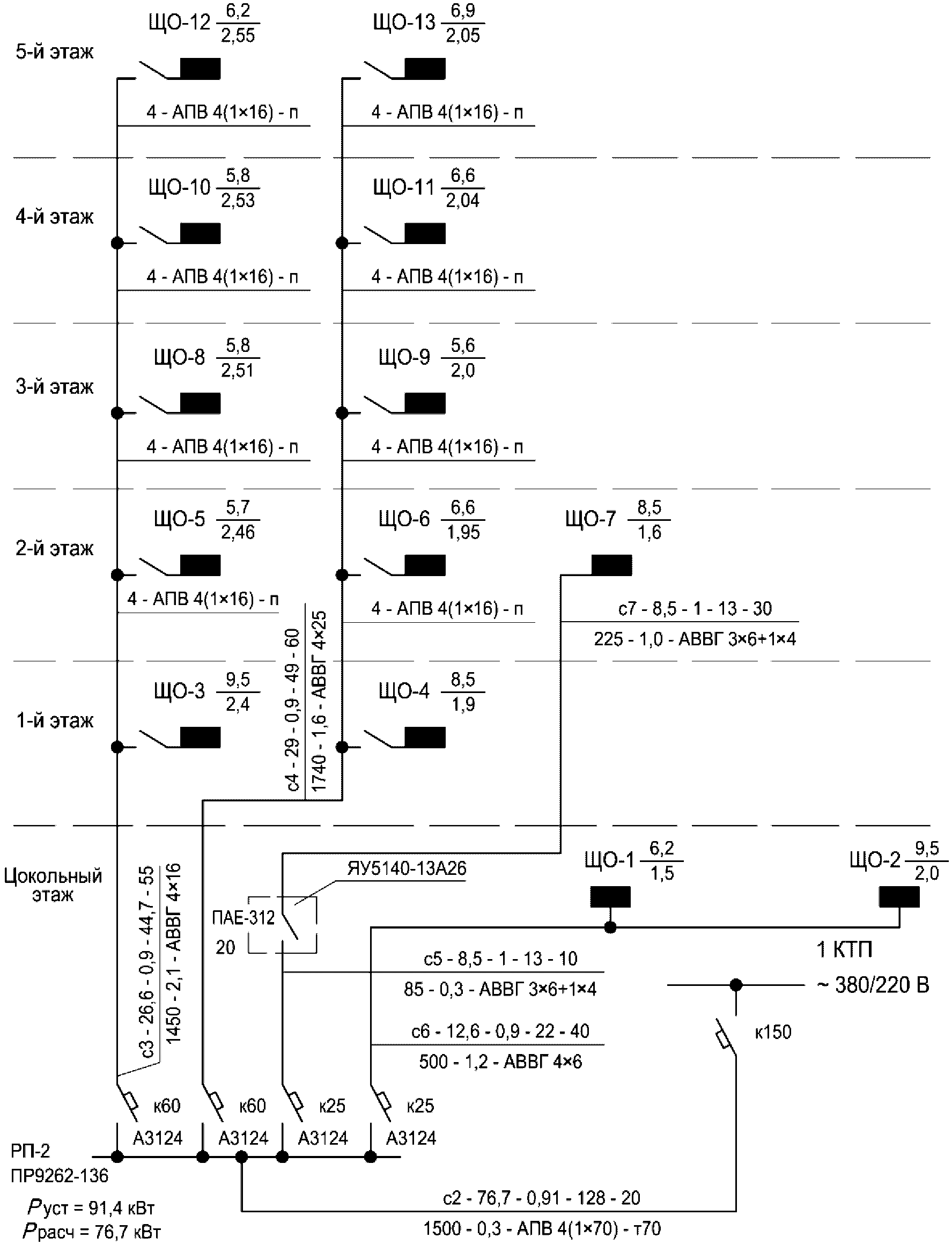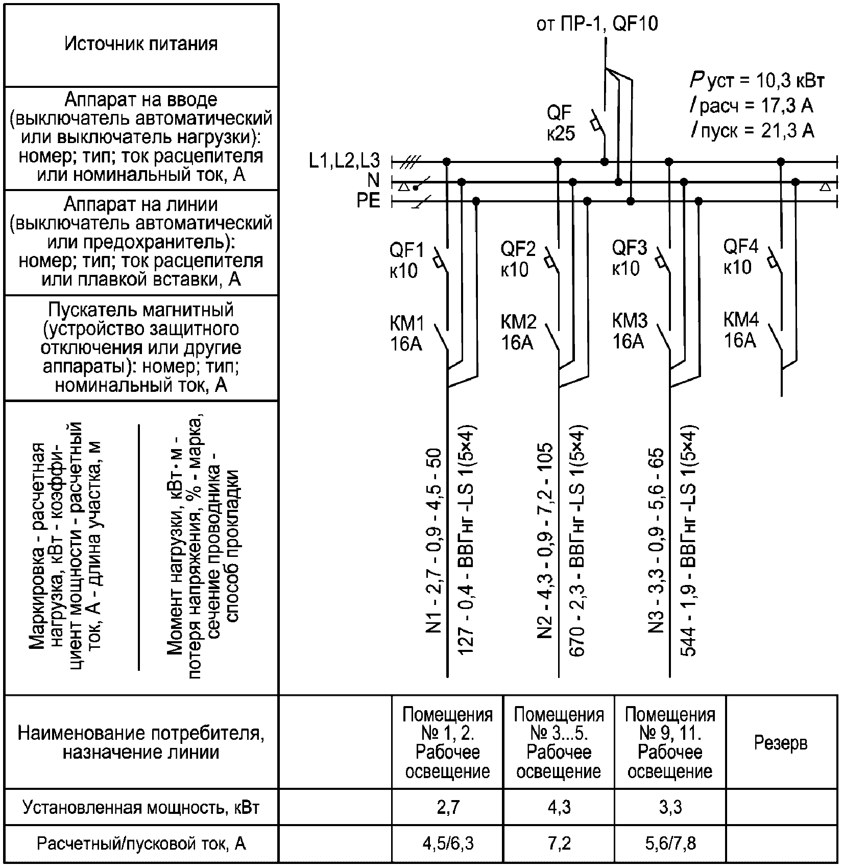 7. Надписи на линиях питающей и распределительной сетей указывают в следующем порядке: номер линии - марка, количество и сечение проводников - способ прокладки | н1-ВВГнг-1(5x10)-т40 |