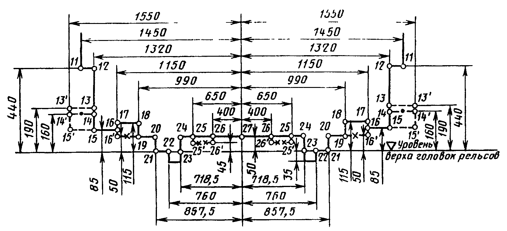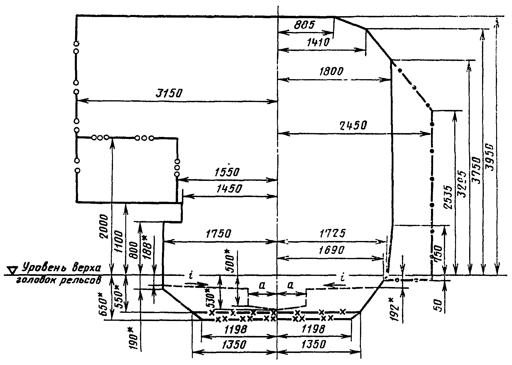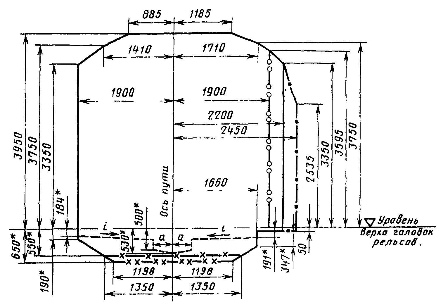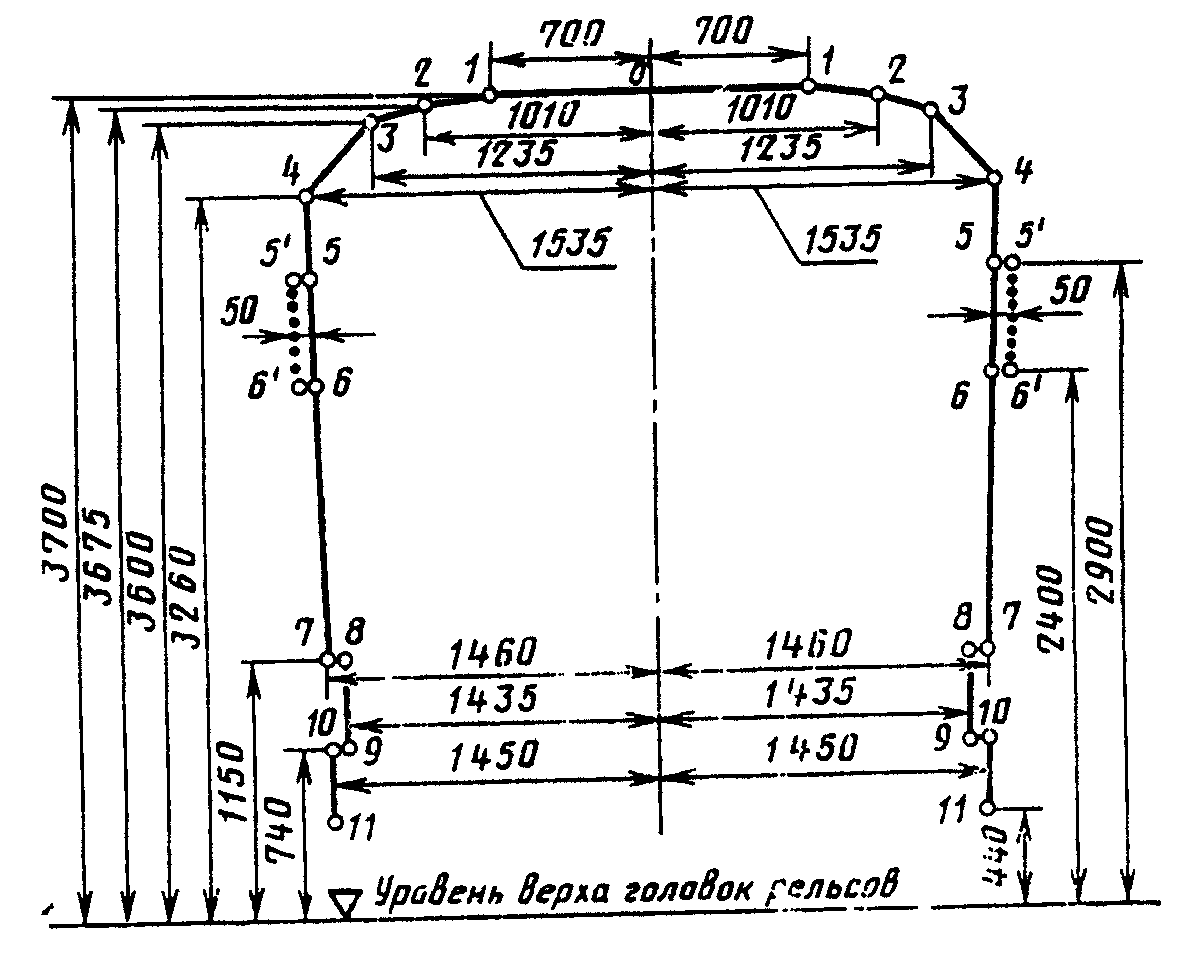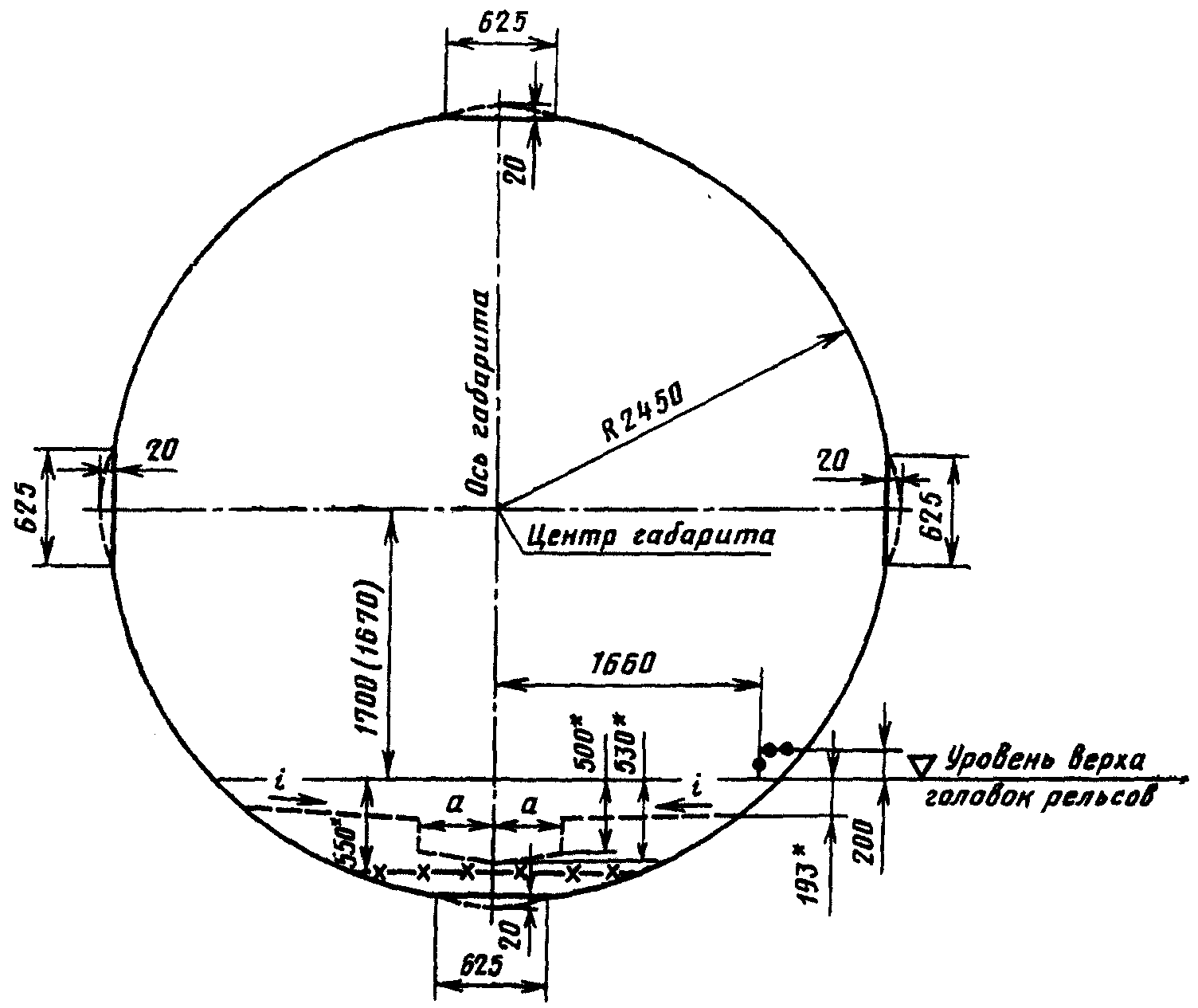 где 1700 (1670) - расстояние от центра габарита до точки, лежащей в плоскости касательной к головкам рельсов посередине пути, соответственно, при рельсах типов Р50 и Р65, мм;