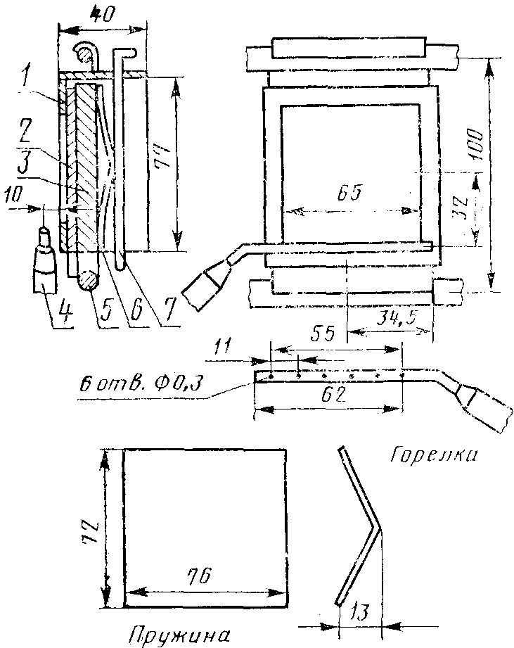 горелка шестифакельная 6, представляющая собой трубку из нержавеющей стали диаметром (2,0 - 2,5) мм. Конструкция держателя и горелки, а также их взаимное расположение приведены на