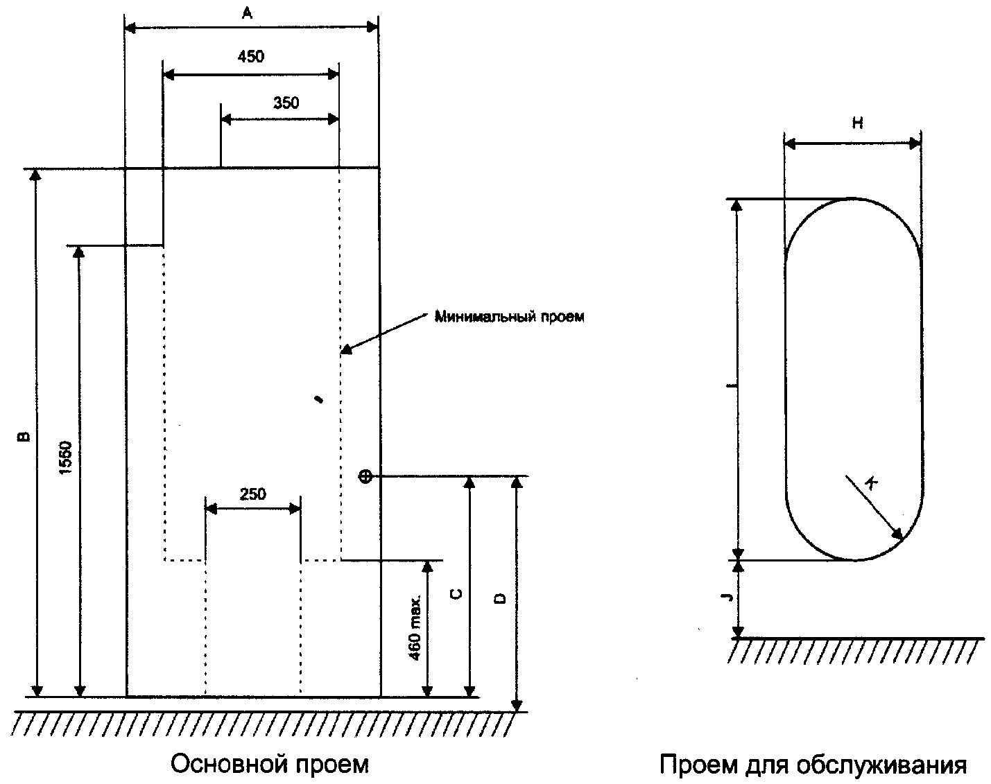 рисунке 1. Расстояние до нижней (узкой) кромки проема может быть увеличено с 460 до 770 мм с одновременным увеличением минимальной ширины проема с 250 до 300 мм.
