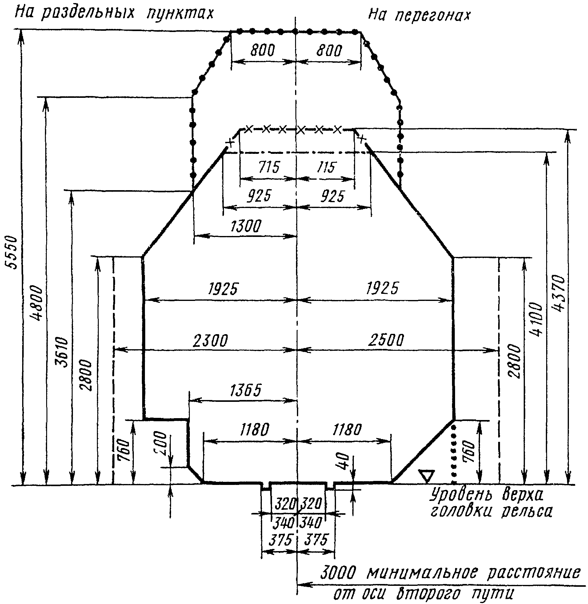 В особо трудных условиях, при соответствующем обосновании и по разрешению министерства или ведомства, в ведении которого находятся железнодорожные пути, это расстояние может быть уменьшено: до внутреннего края опор контактной сети, мачт светофоров и семафоров - до 2300 мм на перегонах и до 1925 мм на раздельных пунктах; до зданий - до 2300 мм на перегонах;
