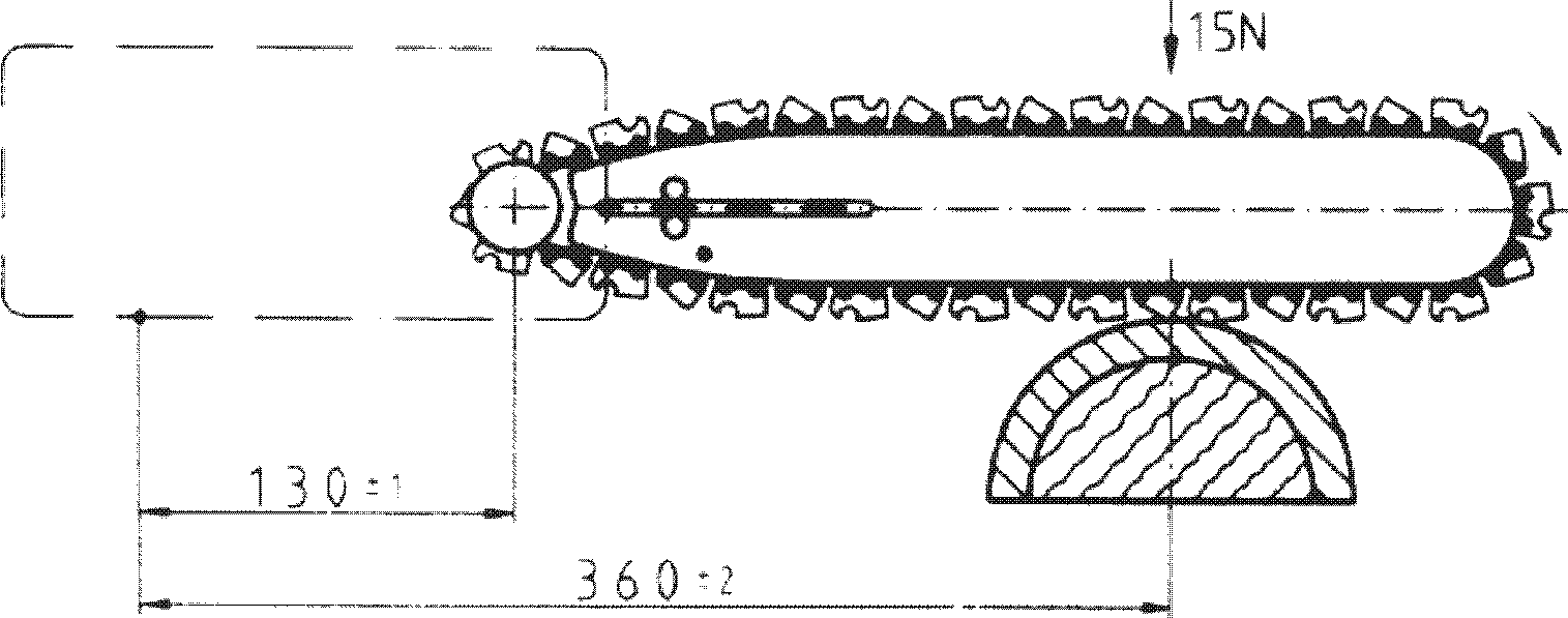 Для выполнения испытания скорость движения цепи пилы сначала доводят до требуемого значения с использованием любого подходящего привода. В момент испытания привод отключают от пилы и маховика, одновременно опуская блок пилы с минимальной высоты вниз с поворотом до испытуемого образца. Пила постепенно, не прекращая движения, продолжает двигаться (и в обычных условиях врезаться в образец), пока вся ее кинетическая энергия не будет израсходована.