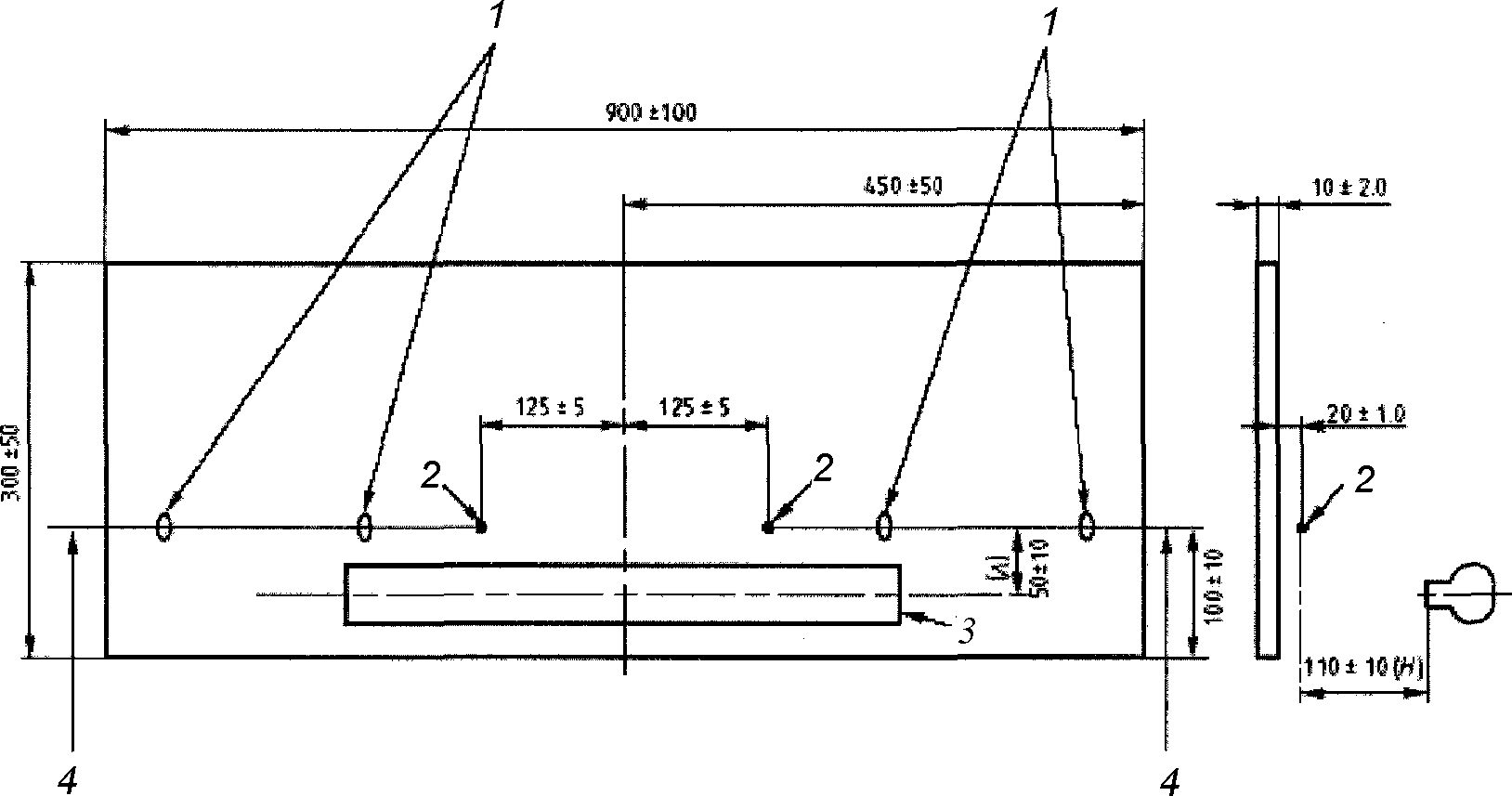рисунке A.1. Кончики термопар должны находиться на расстоянии (20 +/- 1) мм от фронтальной стороны испытательной панели. Горизонтальная осевая линия термопар должна находиться примерно на (100 +/- 10) мм выше нижнего края панели. Панель представляет собой плиту из теплостойкого негорючего неметаллического материала длиной (900 +/- 100) мм, высотой (300 +/- 50) мм и толщиной (10 +/- 2) мм.
