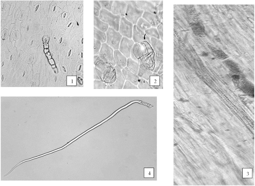 2 - эфирномасличные железки (400x); 3 - секреторный ход
