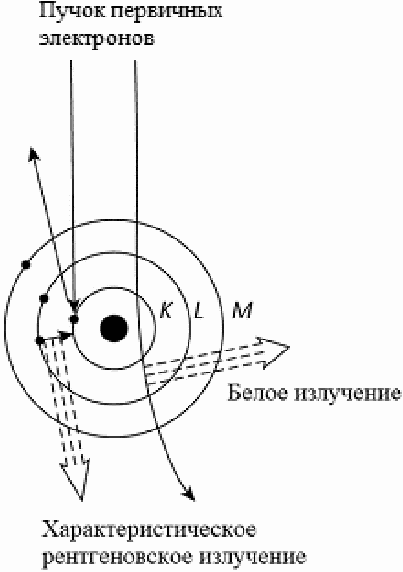 Рентгеновское излучение образуется при взаимодействии ускоренных первичных электронов с элементами вещества испытуемого образца. Когда электрон из ускоренного пучка электронов сталкивается с орбитальным электроном атома вещества испытуемого образца, возникающее взаимодействие может поднять данный орбитальный электрон на более высокий энергетический уровень, либо ионизировать атом. Рентгеновское излучение, возникающее в результате торможения ускоренных электронов в веществе, называется тормозным или белым излучением, а возникающее в результате возбуждения атомов вещества - характеристическим рентгеновским излучением.