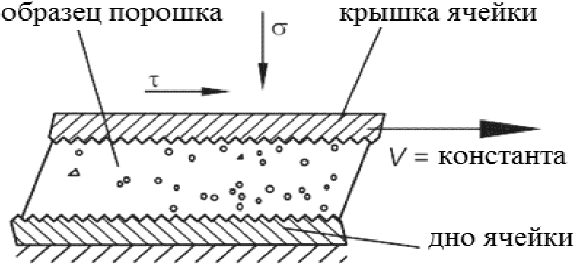 Один из типов сдвиговых ячеек представляет собой цилиндрическую сдвиговую ячейку, которая в горизонтальном разрезе формирует плоскость сдвига между нижним неподвижным основанием и верхней подвижной частью кольца сдвиговой ячейки. После консолидации слоя порошка в сдвиговой ячейке определяют силу, необходимую для сдвига слоя порошка за счет перемещения верхнего кольца. Модели кольцевой сдвиговой ячейки имеют несколько преимуществ по сравнению с цилиндрической сдвиговой ячейкой, включая использование меньшего количества испытуемого образца. Недостатком кольцевой ячейки, обусловленным ее конструкцией, является то, что слой порошка сдвигается неоднородно, так как частицы порошка на внешней части кольца сдвигаются больше, чем частицы внутренней области. Сдвиговая ячейка типа пластины представляет собой тонкий слой порошка между шероховатыми поверхностями - неподвижной нижней и подвижной верхней.