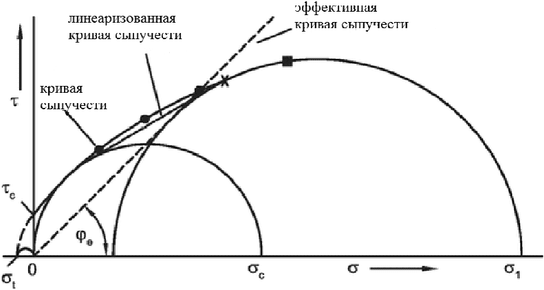 Во многих случаях, кривая сыпучести является линеаризованной, как и касательной относительно обоих кругов напряжений Мора. Линеаризованная кривая сыпучести характеризуется углом наклона