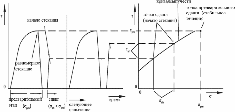 , а затем подвергается сдвигу. Предварительный этап прекращается при достижении постоянной сыпучести, которая характеризуется постоянным значением напряжения сдвига