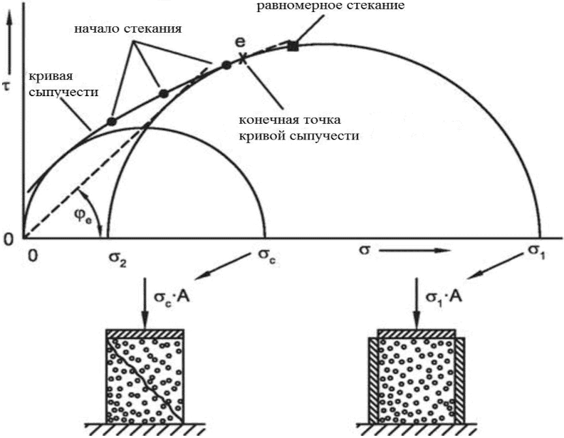 . Поскольку наибольший круг напряжений Мора указывает на установление равномерной сыпучести порошка, угол