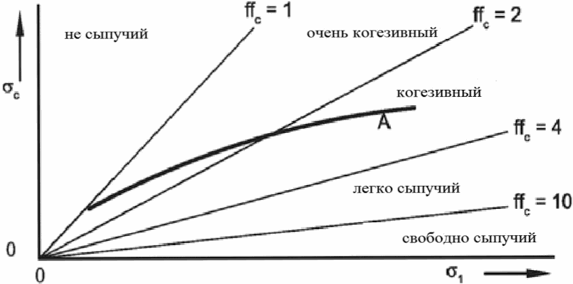 рис. 2. Кроме того, границы диапазонов приведенной выше классификации, изображены в виде прямых линий, каждая из которых соответствует постоянному значению коэффициента сыпучести (ff