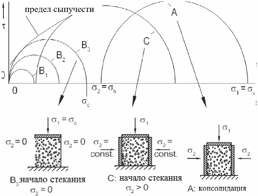 (рис. 1), образец нагружают увеличивающимся вертикальным напряжением после того, как он был освобожден от напряжения консолидации и полый цилиндр был удален. По мере увеличения вертикальной нагрузки, напряженные состояния при различных уровнях нагрузки представляются кругами напряжений с увеличивающимся диаметром (круги напряжений B