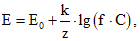где E - разность потенциалов между индикаторным ионселективным электродом и электродом сравнения (электродвижущая сила), мВ;