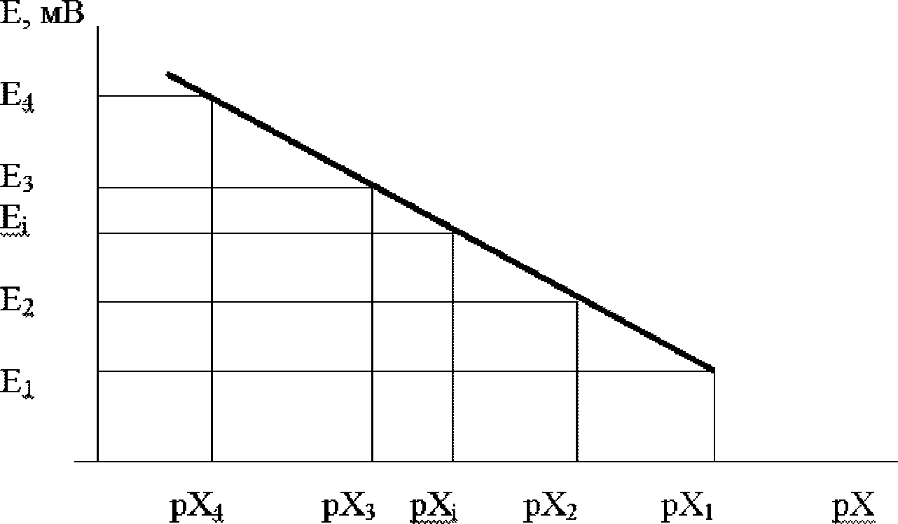 0 и экстраполируют полученную прямую до пересечения с осью абсцисс. В точке пересечения концентрация испытуемого раствора определяемого иона выражается уравнением: