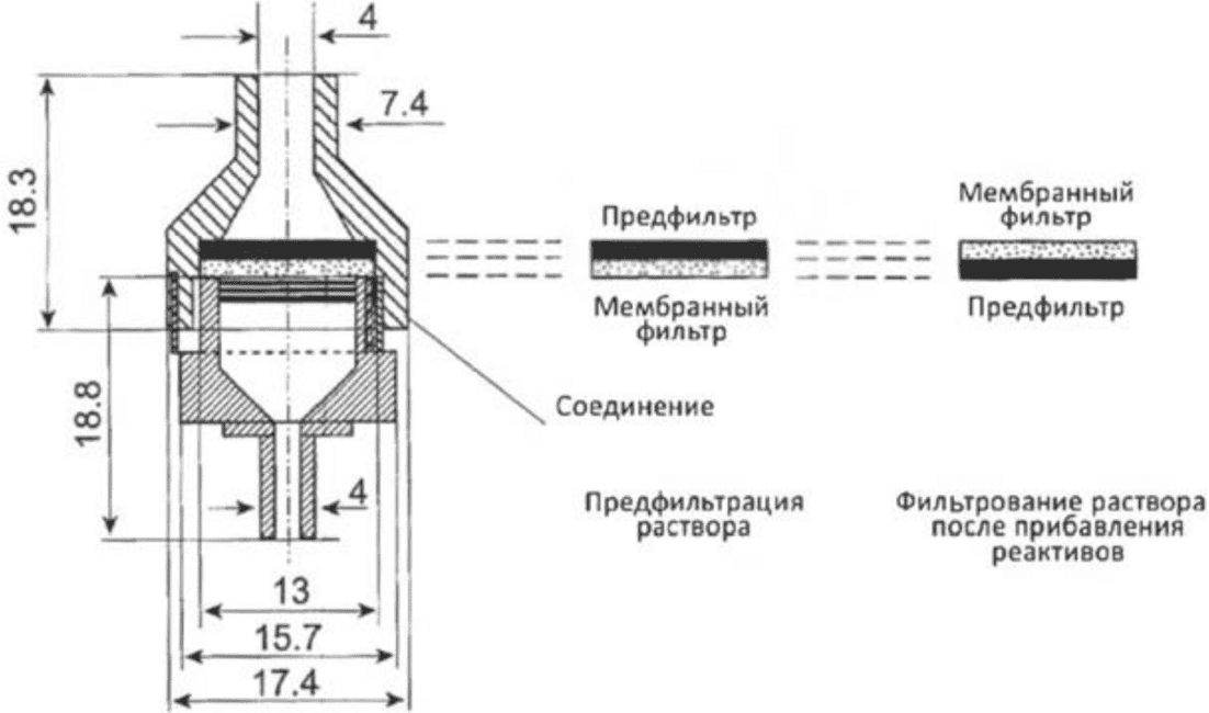 Помещают испытуемый раствор в шприц, устанавливают поршень и равномерно надавливают на него до тех пор, пока вся жидкость не будет отфильтрована. Открывают держатель, извлекают предфильтр и проверяют, не загрязнен ли мембранный фильтр. В случае загрязнения заменяют его другим мембранным фильтром и повторяют операцию.