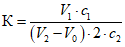 Коэффициент К должен находиться в пределах от 0,98 до 1,02. Если коэффициент К отличается от указанных пределов (более чем на +/- 2%), то раствор следует разбавить или укрепить на основании следующего расчета.