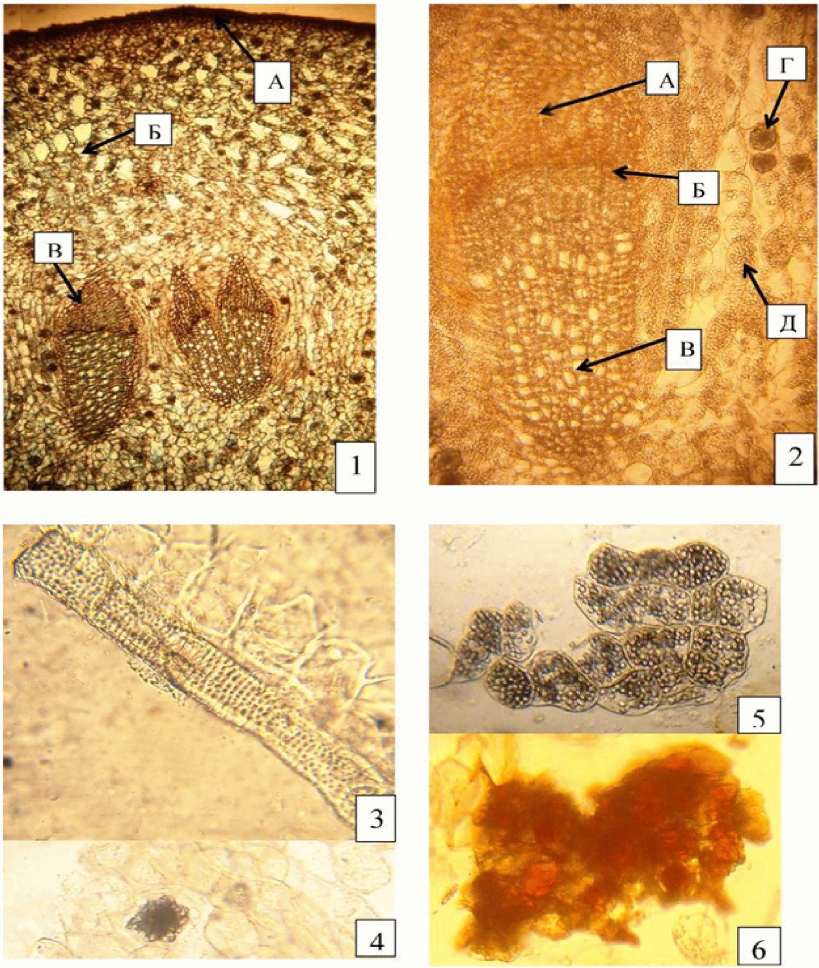 В - сосуды древесины, Г - друзы кальция оксалата, Д - клетки