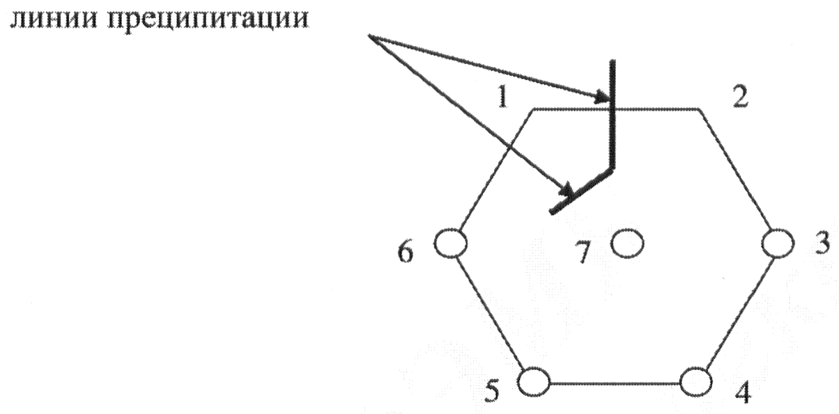 В застывшем агаровом геле по трафарету готовят лунки для реагентов (рис. 1), используя трубки-пробойники, изготовленные из латуни или нержавеющей стали, с заточенным концом со стороны внутреннего диаметра (2-3 мм) или используют стандартные штампы. Расстояние между внешними краями лунок должно быть равно 5-6 мм. Агаровые пробки из лунок аккуратно удаляют с помощью поперечно-срезанной пастеровской пипетки, не допуская отслаивания геля от стекла.