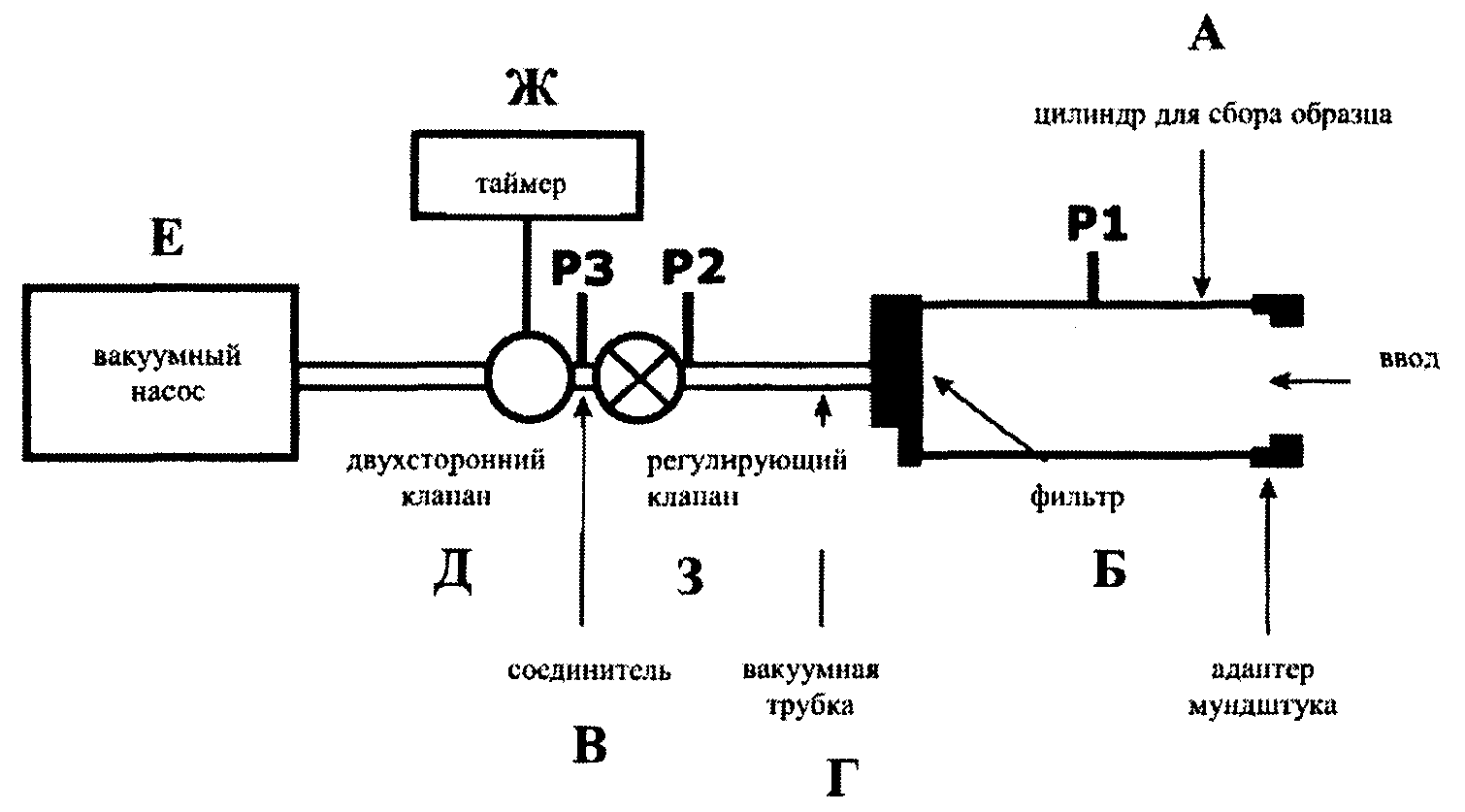 Е | Вакуумный насос | Насос должен обеспечивать достаточную скорость воздушного потока через собранную систему. Насос соединяют с двухсторонним клапаном с помощью вакуумной трубки (внутренний диаметр  мм) |