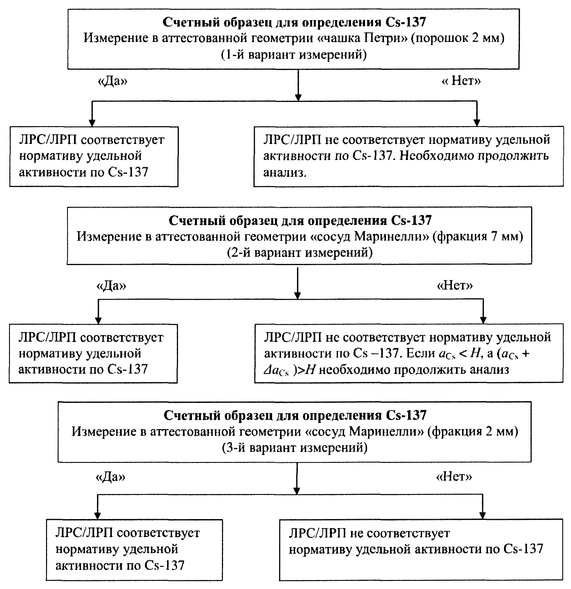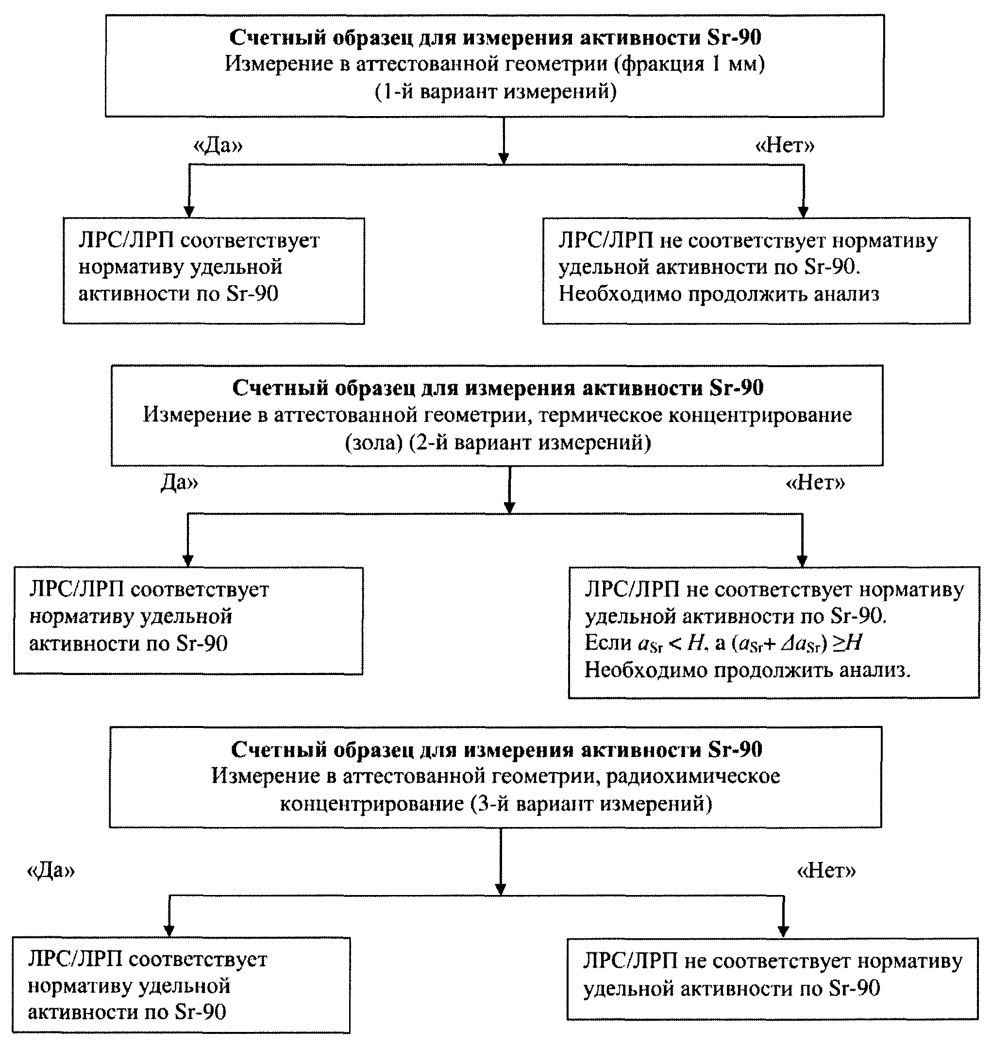 В схеме под утвердительным ответом "Да" подразумевается соответствие полученного результата нормативу удельной активности Sr-137 в ЛРС/ЛРП. Ответ "Нет" - если ЛРС/ЛРП относится ко второй или третьей группе (по критериям радиационной безопасности).