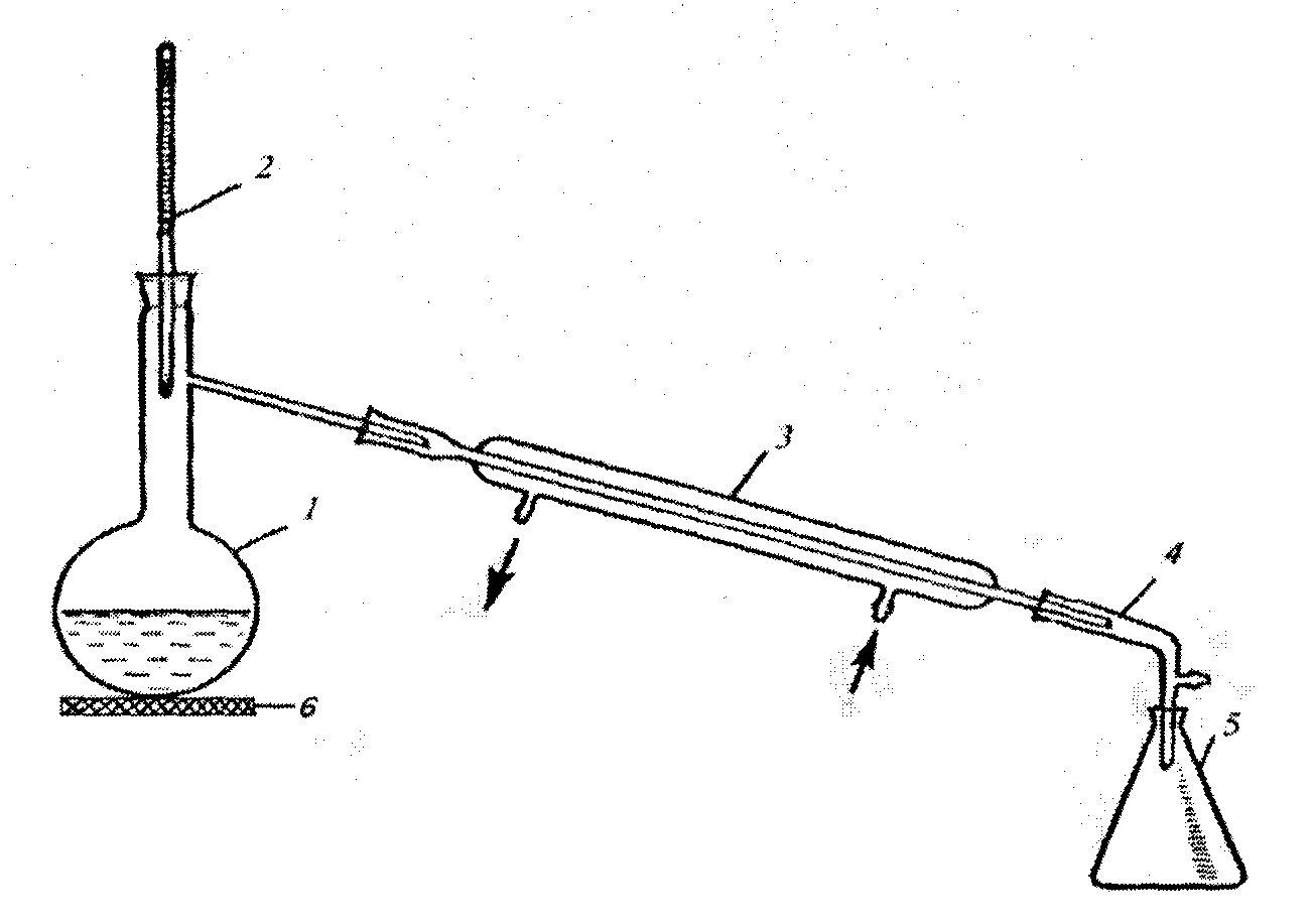 Нагревают перегонную колбу на электронагревателе (6). Для равномерного кипения в колбу с испытуемым раствором помещают капилляры, пемзу или кусочки прокаленного фарфора. Температуру паров измеряют термометром (2), размещенным в приборе таким образом, чтобы ртутный шарик располагался на 0,5-1,0 см ниже отверстия отводной трубки. При соблюдении температурных пределов перегонки достигается равномерное кипение испытуемого раствора. Если испытуемый раствор при перегонке сильно пенится, то прибавляют 2-3 мл концентрированной фосфорной или серной кислоты, кальция хлорид, парафин, воск (2-3 г).