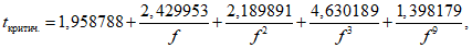 t = 1,958788 + 2,429953/f + 2,189891/f2 + 4,630189/f3 + 1,398179/f9 при P = 95%;
