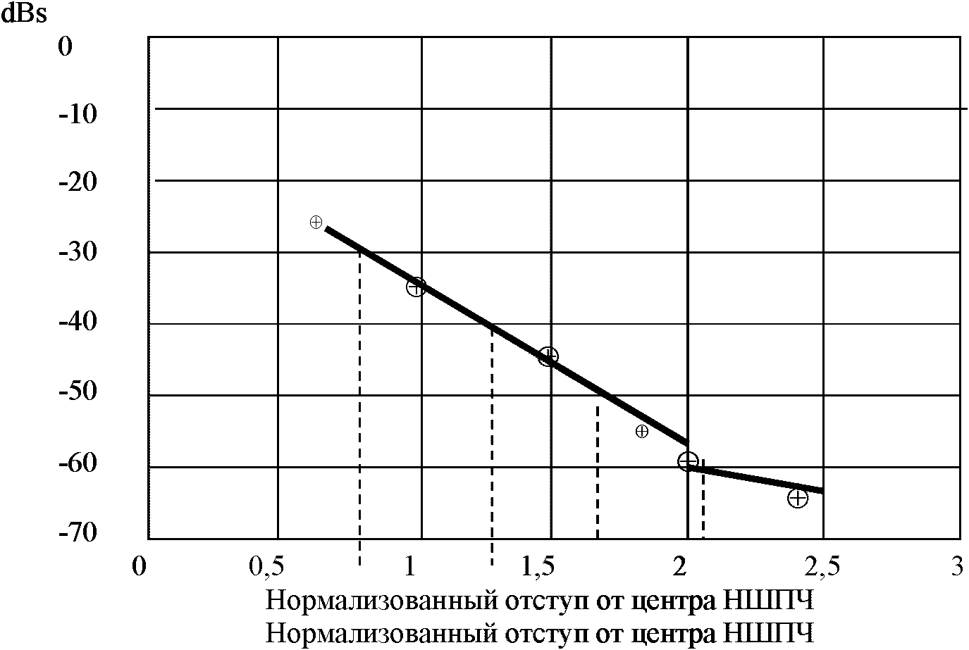 Рис. 1. Маска огибающей внеполосных излучений цифрового сигнала звукового радиовещания с модуляцией вида COFDM (DRM).