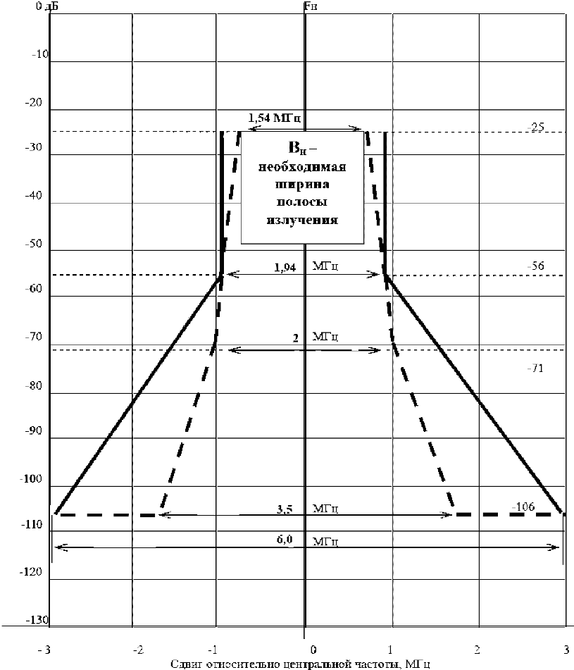 2.4 Полоса частот радиоизлучения на уровне X дБ: полоса частот излучения радиопередающего устройства, за пределами которой любая дискретная составляющая спектра внеполосных радиоизлучений или спектральная плотность мощности внеполосных радиоизлучений ослаблены относительно заданного (исходного) уровня 0 дБ до уровня не менее чем X дБ.